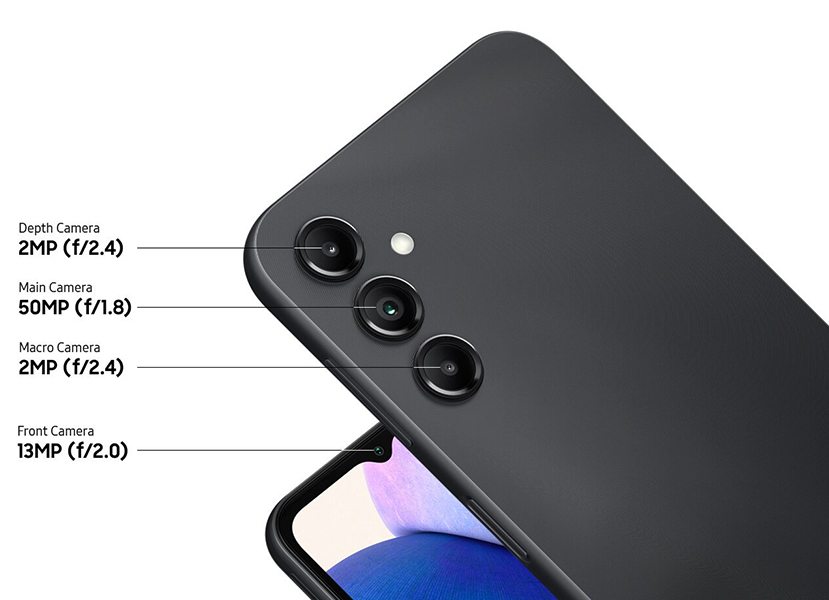 Smartphone SAMSUNG Galaxy A14- SM-A146UZKDXAA / Ecran : FHD+ Infinity-V de 6,6P LCD PLS - 90Hz (1080 x 2408)pixels / Processeur : Mediatek MT6833 Hélio G80 - Dimension 7 nm Octa-cœur (2x2,4 GHz et 6x2,0 GHz) / Système d’exploitation : Android 13.0 / Mémoire RAM : 4Go / Stockage : 128 Go / Appareil photo arrière : Principal : 50Mpx, F1.8 + Macro 2MP, F2.4 + Profondeur 2MP, F2.4 Flash LED, panorama, HDR 1080p@30fps Avant : 13 Mpx, f/2.0 1080p@30fps / Capacité de Batterie : 5000 mAh avec Wifi 4G et Bluetooth 5.2, GPS / Capteur d’empreintes digitales / Garantie 1an.
